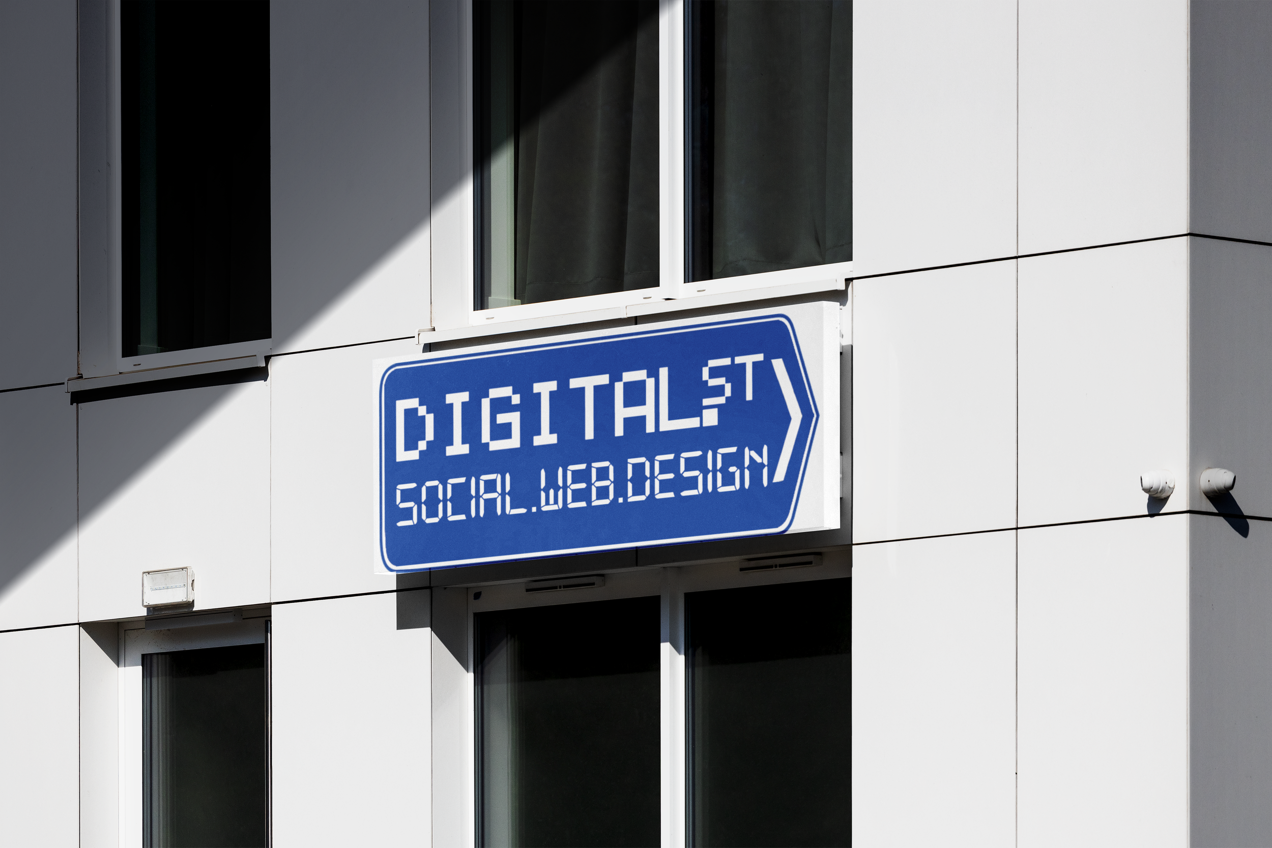The brand identity is minimal and bold, indicating a message of clarity and creativity. The use of a street sign-inspired logo signifies direction and guidance within the digital space. The color scheme of blue and yellow signifies a balance of trust and energy, while the font style is bold and modern, indicating a confident digital presence.