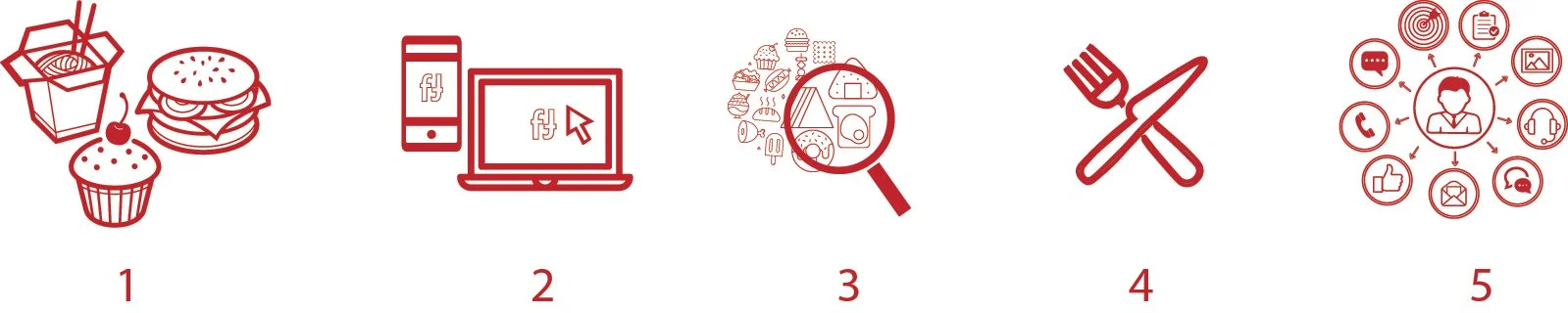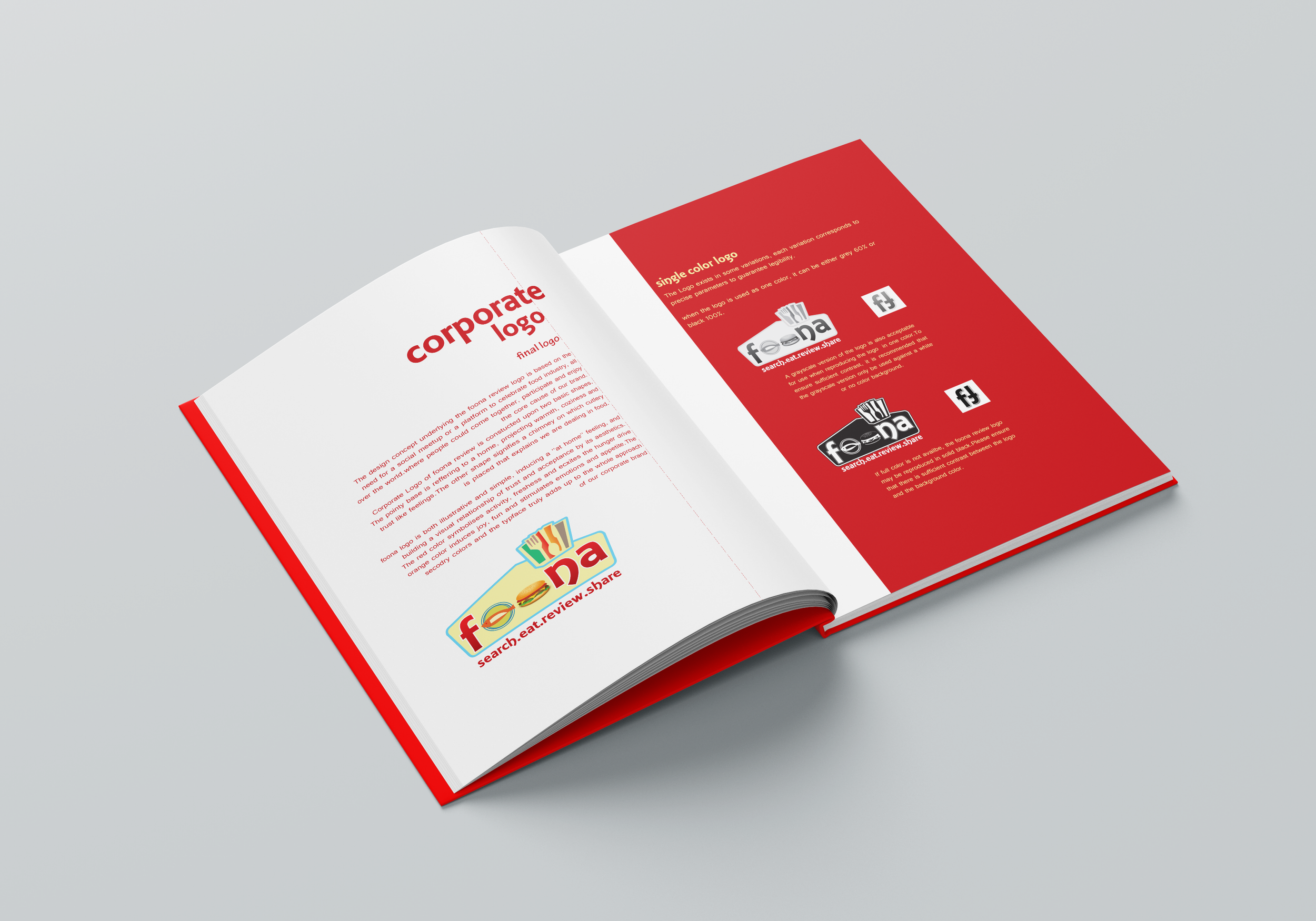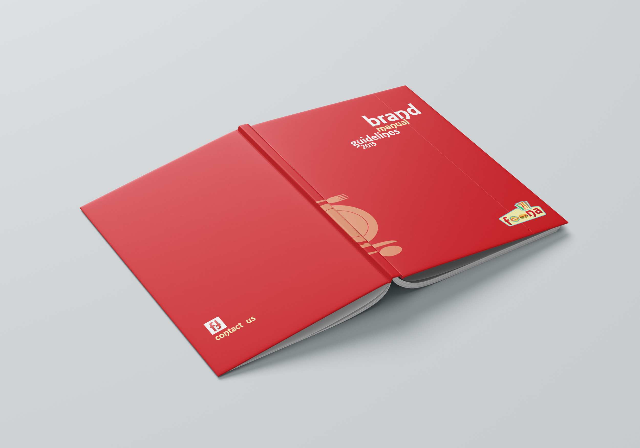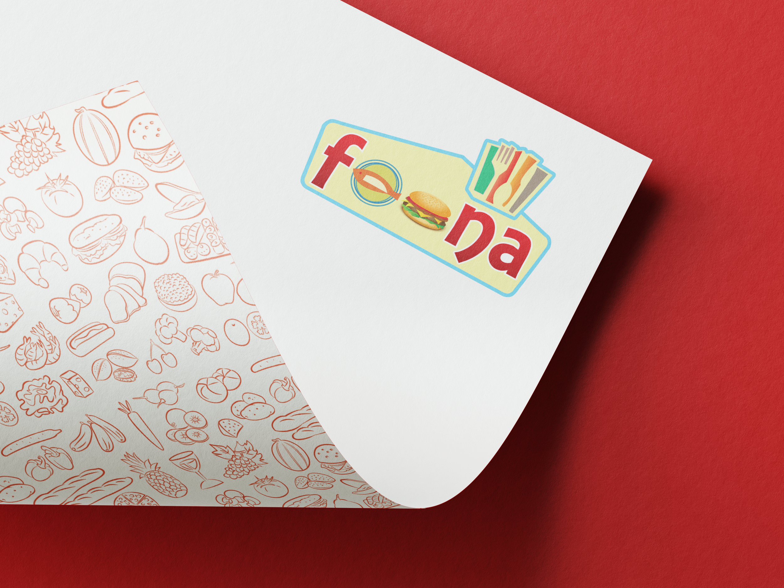 A strong red and white color scheme was used for the design, which stimulates hunger and energy, while keeping the design professional with sufficient use of whitespace. The distinctive cut on the logo represents a food theme, which gives a sense of tactility to the design. A subtle food iconography adds texture without visual clutter, and a clear typography ensures quick reading and business clarity.